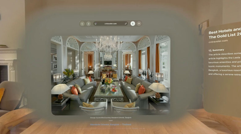 使用者可以在Safari選擇空間瀏覽,改變文章呈現的方式、隱藏令人分心的事物,並且隨著滑動頁面讓內容以空間場景生動呈現。網頁開發者可以將3D模型直接嵌入網頁,讓使用者能在充滿深度和維度的頁面中購物及瀏覽,並在Safari裡檢視並操作3D物件和模型。