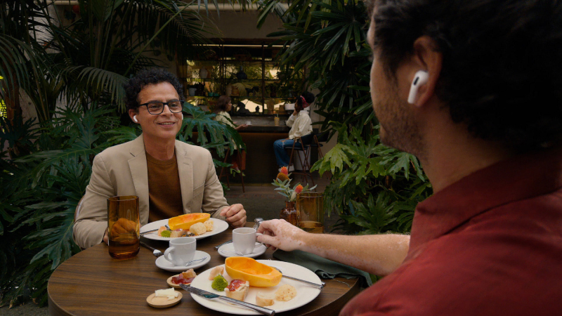 透過AirPods Pro 3,即時翻譯可實現跨特定語言的面對面交流,目前處於測試階段。這種變革性的免持功能由運算音訊和Apple Intelligence提供支援,可幫助人們輕鬆建立聯繫。啟用後,即時翻譯可協助使用者理解另一種語言,並透過使用AirPods自然地說話與他人溝通。為了與沒有這種免持功能的人互動,可以選擇將iPhone用作水平顯示器,以對方的首選語言顯示用戶所說內容的實時轉錄。當對方回應時,他們的發言會透過AirPods翻譯成使用者的首選語言。