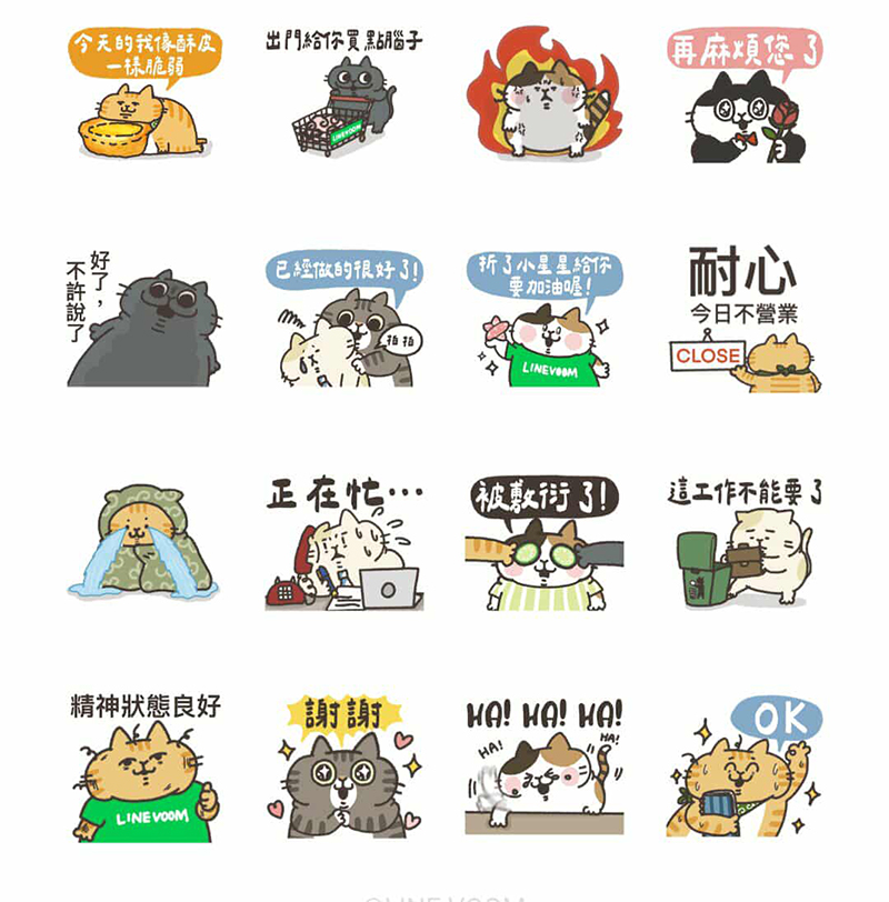 LINE VOOM與耍廢貓的日常合作推出可愛的貼圖,只要追蹤8位LINE VOOM 的熱門創作客,即可免費下載此組貼圖。