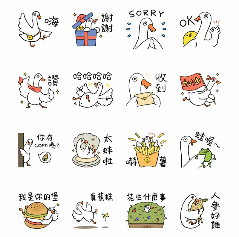 快樂鵝鵝們有趣的諧音梗貼圖上架啦!只要開通「LINE購物」護照,就能成功下載貼圖,快讓快樂鵝鵝們亂入你的LINE聊天室吧!。