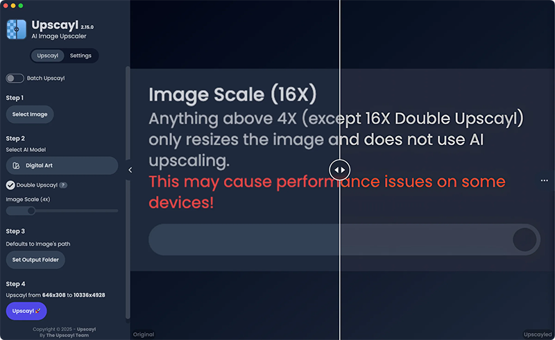 Upscayl 能夠將圖片放大高達 16 倍,這個放大倍率在目前市場上屬於頂尖水準(多數需要付費)。軟體採用先進的 AI 演算法,能夠在放大過程中智慧預測缺失的像素資訊,並重建細節,達到接近無損的放大效果。