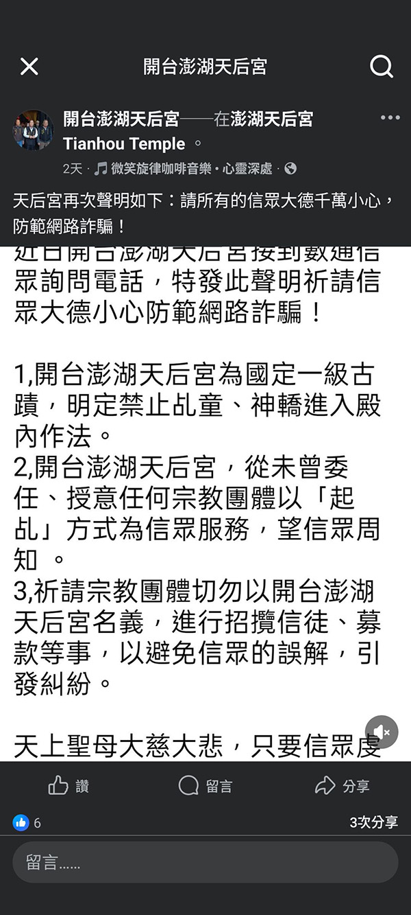上月底有詐騙集團在FB冒用天后宮師父名義,謊稱能為信徒開運算命,並要求捐獻金錢以消災解厄、斬桃花去小人,黃姓信徒一度信以為真差點被騙。(圖片來源:澎湖縣政府)