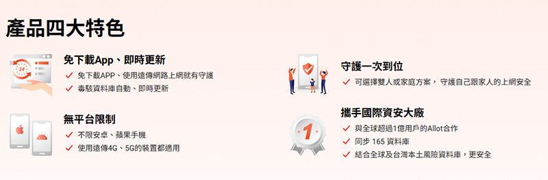 遠傳「防駭心守護」與世界級網路資安大廠Allot合作,特點為免安裝、自動更新、無平台限制,只要使用遠傳4G/5G上網就能受到保護,一旦偵測到網頁有病毒、任何惡意程式或釣魚連結,「防駭心守護」會自動攔阻,避免個資遭到未經授權的存取,同時還可以過濾與封鎖詐騙網站,幫助你的電腦與手機多一層防護。