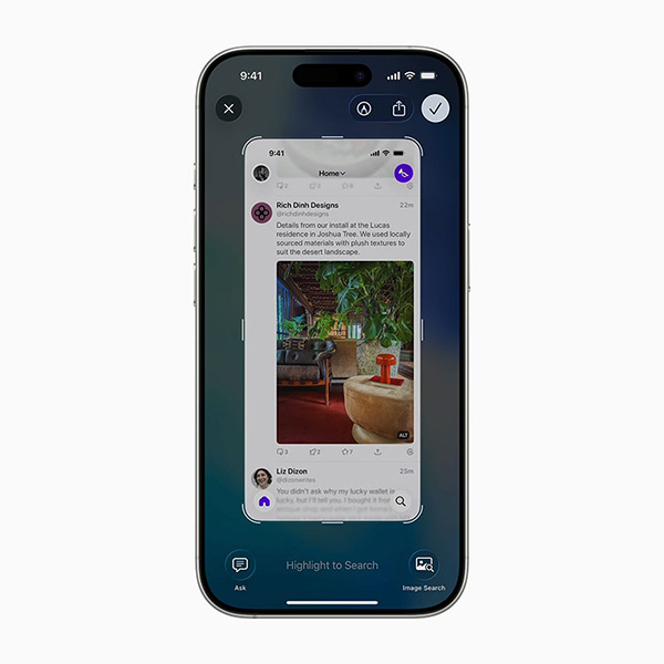 螢幕截圖後會出現視覺智慧工具。(圖片來源:Apple)