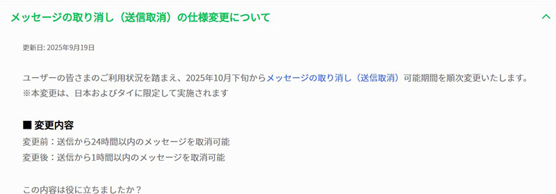 日前LINE宣布,從2025年10月下旬開始,「收回訊息」功能時限將縮短到僅剩1小時,將率先從日本與泰國開始實施,台灣尚未有跟進計畫。(圖片來源:LINE)