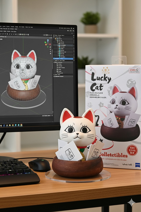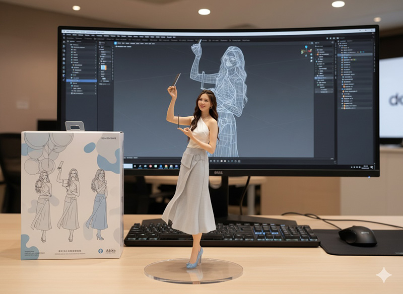 這段指令說的重點是,「製作一個1/7比例的商業化角色模型,採用寫實風格並置於真實環境中,模型擺放在電腦桌上,有一個圓形透明壓克力底座,底座上沒有任何文字,電腦螢幕顯示的內容是此模型正在進行的3D建模過程,在電腦螢幕旁邊,擺放著一個玩具包裝盒,設計風格仿效高品質收藏級模型盒裝,外盒上印有二次元平面插圖。」;當然,你也可以依照需求,調整畫面的比例,或是細節、風格的呈現。