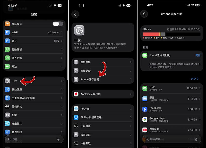 2. 確保接收裝置有足夠的可用儲存空間來接收AirDrop傳遞過來的檔案。可以打開「設定>>一般>>iPhone儲存空間」查看剩餘空間。