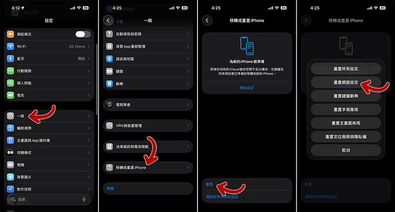 1. 如果Wi-Fi連線有問題,可以嘗試從「設定>>一般>>移轉或重置iPhone」中選擇「重置>>重置網路設定」選向來重設Wi-Fi網路。