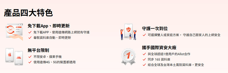 遠傳「防駭心守護」與國際級網路資安大廠Allot攜手合作,採用先進雲端防護技術,具備免安裝、自動更新及跨平台等特性。用戶只要使用遠傳 4G/5G 行動上網,即可自動享有資安防護。系統能即時偵測並攔阻含有病毒、惡意程式及釣魚連結的網頁,有效防止使用者個資遭竊取或外洩,讓用戶能夠在數位生活中更安心、安全地上網。