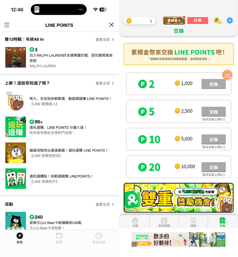 安裝、玩指定的LINE POINTS GAME,完成任務即可賺取點數或以遊戲內的貨幣兌換點數。