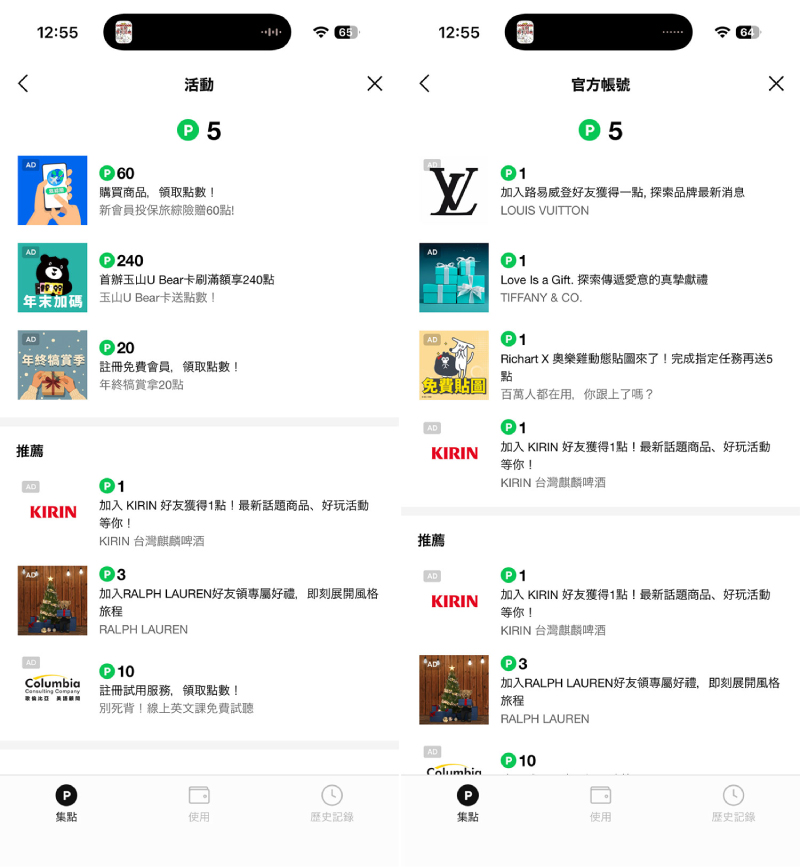 在LINE POINT CLUB裡參加集點任務、加入官方帳號、觀看影片等。
