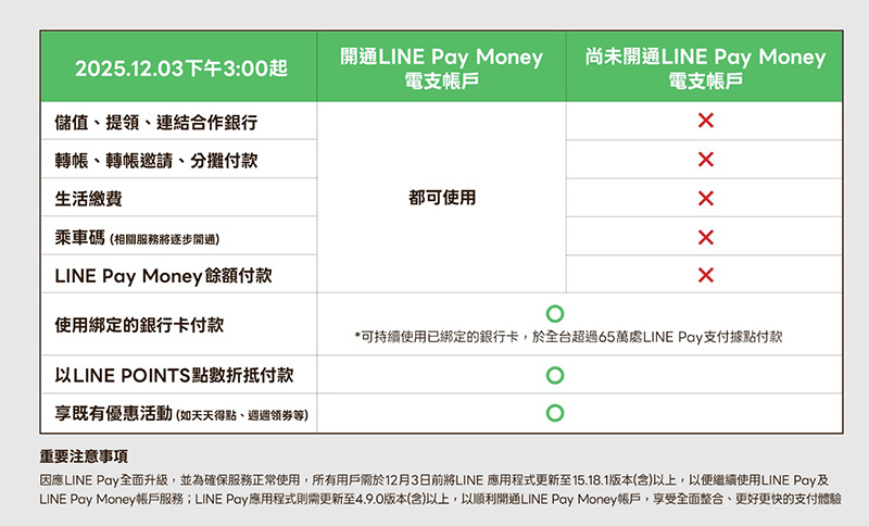 2025年12月3日15:00 起,開通LINE Pay Money電支帳戶可以功能: