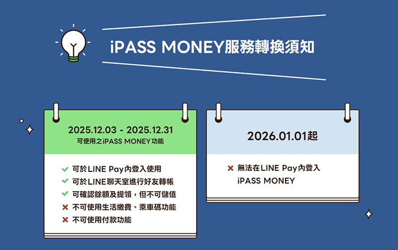 2025年12月3日至12月31日的帳戶轉換期間,用戶仍可透過LINE Pay登入iPASS MONEY帳戶,使用好友轉帳、提領,查看餘額、帳戶紀錄等功能,至於其它功能則需透過iPASS MONEY App進行操作。
