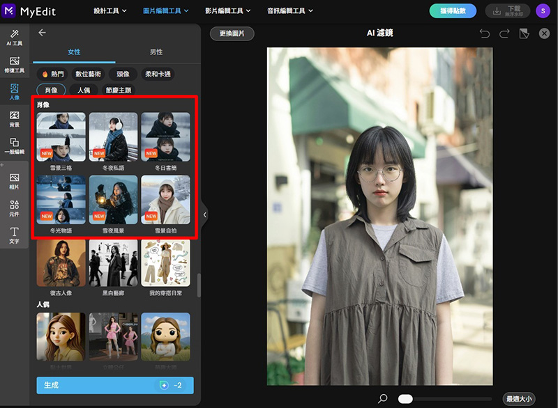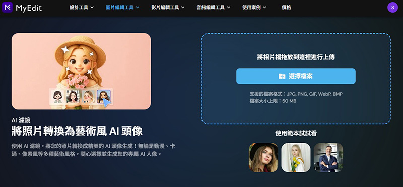1.前往 MyEdit 的「 AI 濾鏡 」,上傳清晰的人像照片。
