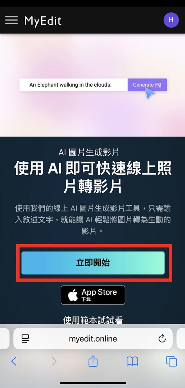 1.前往 MyEdit,並選擇「AI 圖片生成影片」,並上傳要製作動畫的照片。