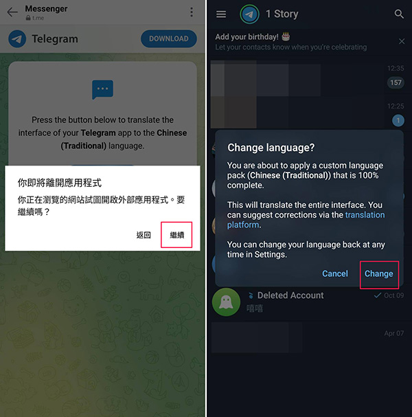 點擊語言包連結後,依照指示點選「Change」確認切換語言,接著就可見到Telegram介面切換為中文語言版本。