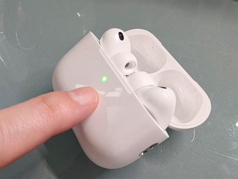 將AirPods放回充電盒,按住盒背按鈕直到正面指示燈轉為閃爍白光,即可重新配對。