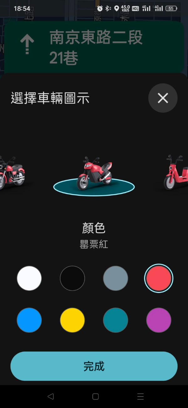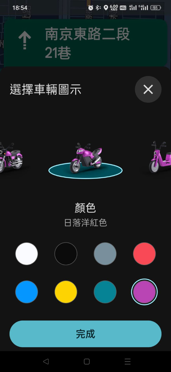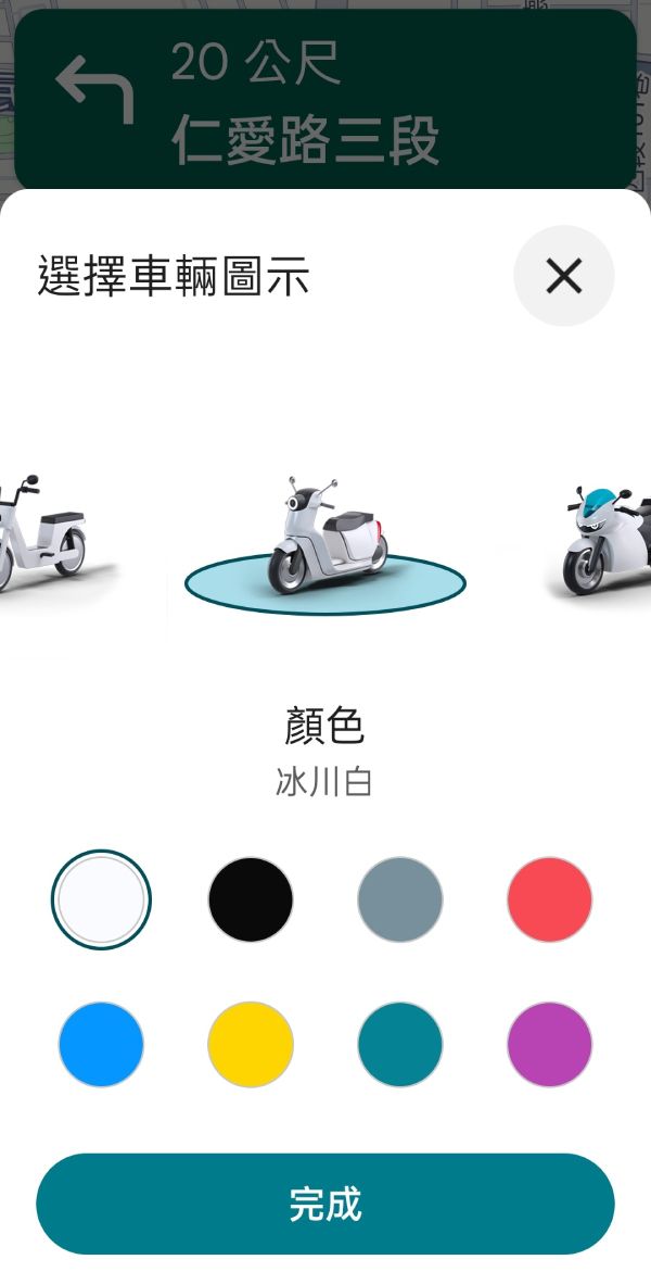 選擇完成後,導航上面的機車圖示,就不再是那藍色箭頭,而是你選擇的機車圖示。