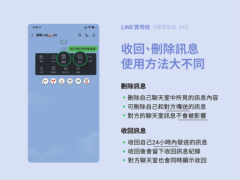 LINE收回跟刪除是完全不同的功能。(圖片來源:LINE)