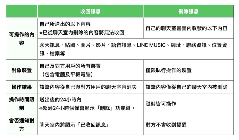 LINE收回跟刪除差異可以參考圖表。(圖片來源:LINE)