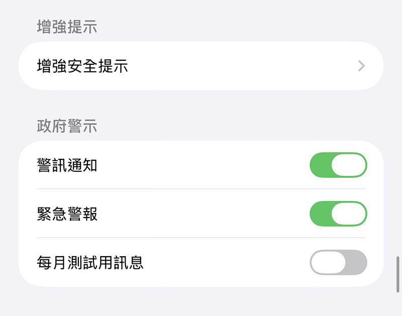 操作方法很簡單,只要進入iPhone的「設定」App,點選「通知」,捲動至畫面最底部的「增強提示」區塊,點選「增強安全提示」;在此頁面中,使用者可以自由管理各類警示的開關,建議開啟「改進提示傳送功能」,以確保在下一次緊急狀況發生時,能爭取到最充裕的反應時間。