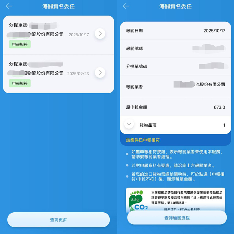 - 便於追蹤與查詢:透過APP可即時檢視包裹報關明細、通關狀態與歷史紀錄,隨時掌握進度。