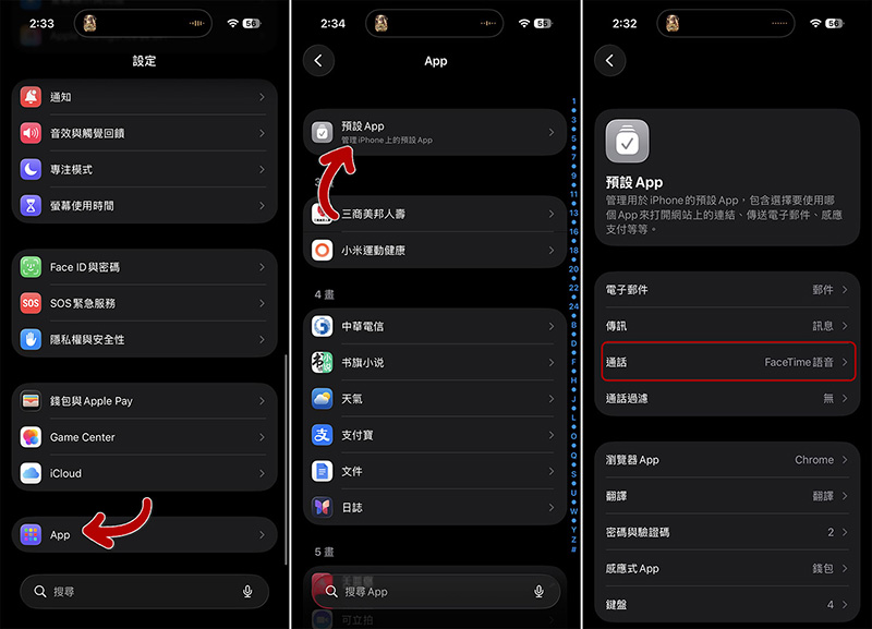 - 點擊「通話」後,將預設通話App改為「FaceTime」。