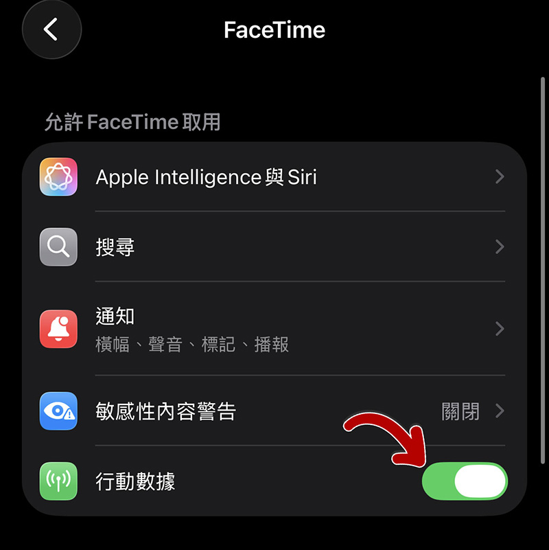 - 將「FaceTime」開啟。