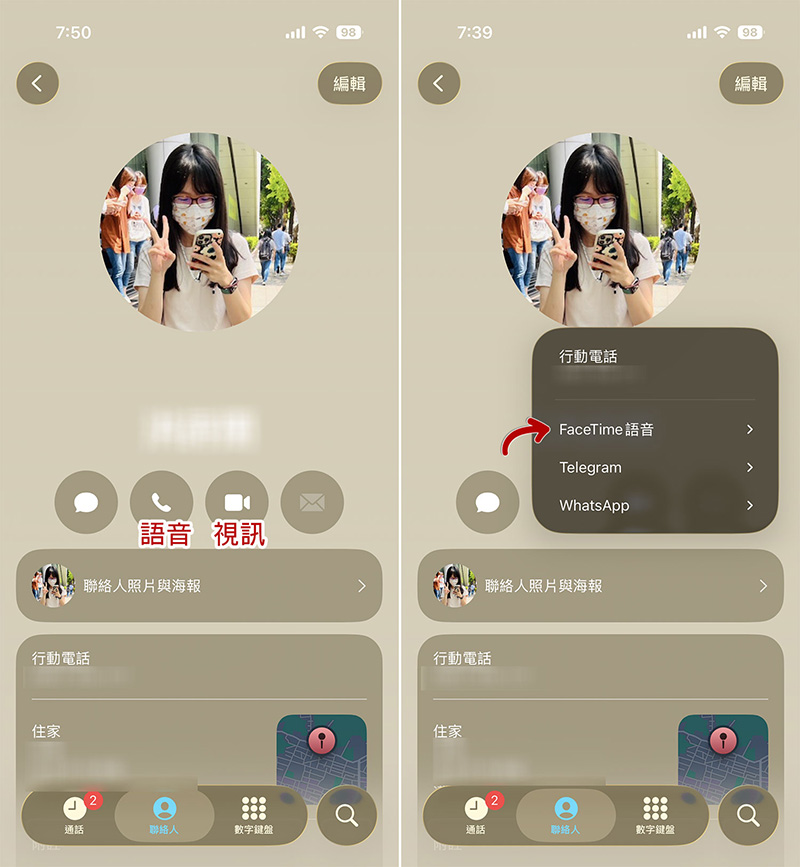 自從iOS將FaceTime與通話整合之後,無論要用FaceTime撥打語音電話或視訊通話都變得簡單許多,不再需要像過去單獨從FaceTime應用程式進去操作。