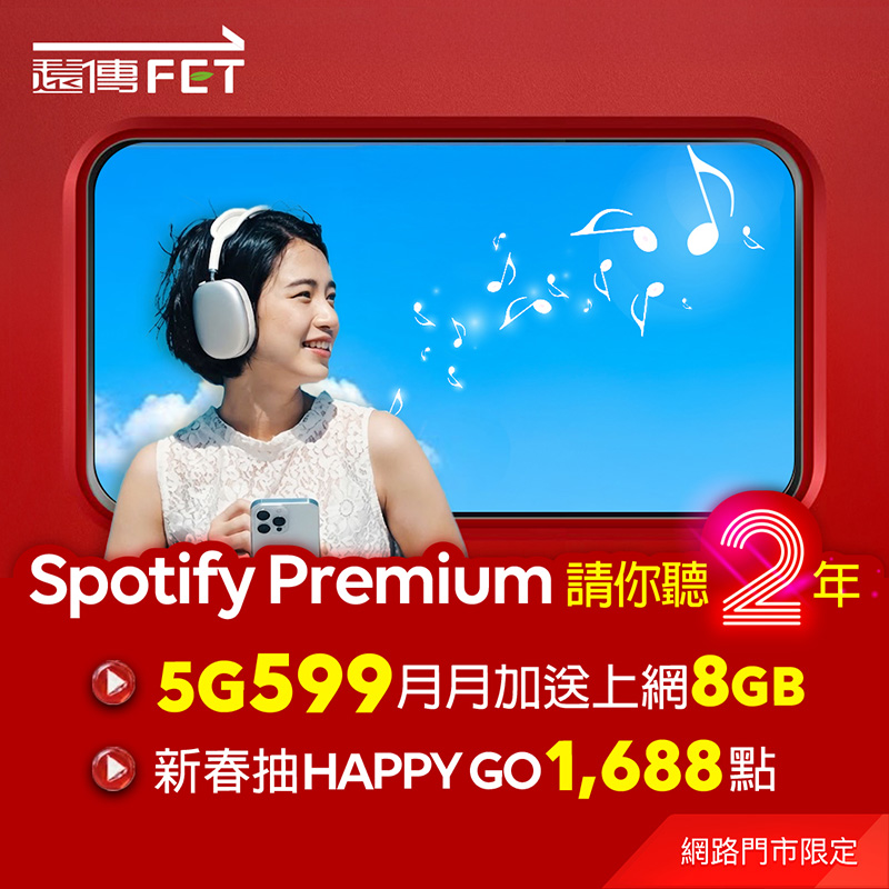 遠傳網路門市_5G金好聽方案月付599每月請你聽Spotify Premium。(圖片來源:遠傳FET)