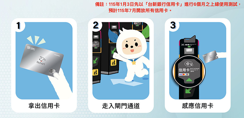 除了電子支付,北捷也同步開放得標廠商台新銀行展開為期6個月的信用卡感應測試;持有台新銀行發行之VISA、Mastercard、JCB信用卡或簽帳金融卡,以及綁定台新卡的Apple Pay、Google Pay與Samsung Pay旅客,在手機解鎖後可直接於閘門信用卡區感應進站,預計7月將進一步擴大開放所有國內外信用卡及Apple Pay ECP快速感應功能。