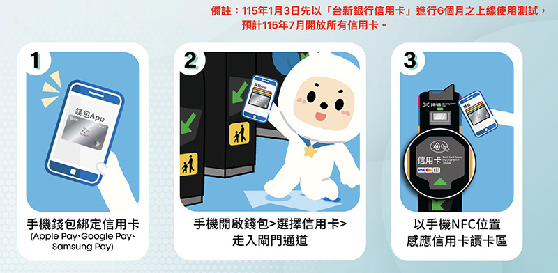 臺北捷運公司自2025年1月3日起升級閘門系統,開放全閘門QR乘車碼感應服務,旅客僅需透過手機開啟電子支付App的乘車碼功能即可掃描進站,同步展開為期6個月的台新信用卡感應測試,包括實體信用卡、手機錢包都能用!
