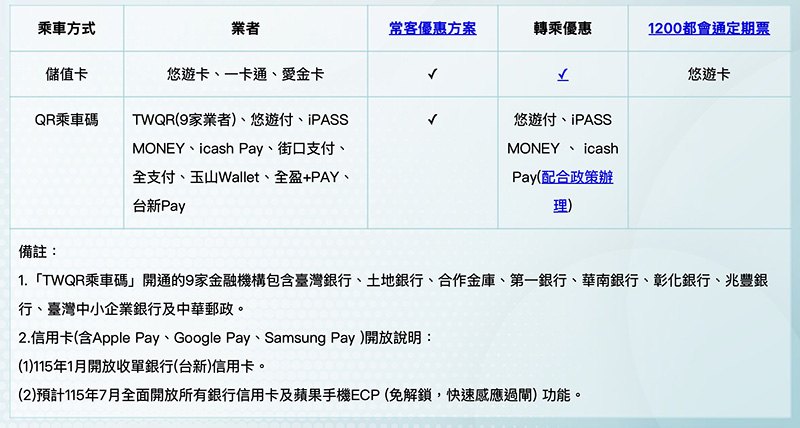 針對雙北生活圈的通勤族,目前悠遊付、iPASS MONEY、icash Pay、街口支付及全支付等5家業者已支援QR乘車碼搭乘雙北市聯營公車,但為配合臺北市公共運輸處規劃,僅有悠遊付、iPASS MONEY與icash Pay這3家業者能同時享有公車與捷運間的轉乘優惠,有轉乘需求的旅客建議優先選用。