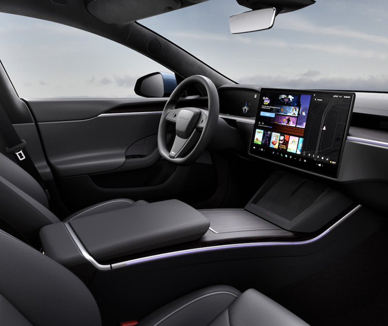 Model S在2021年推出改款,改用Yoke方形平底方向盤,雖然爭議不斷,但視野極佳。中控從直立改為橫向,17吋觸控螢幕解析度更高,後座有專屬8吋螢幕,在2021年推出的三馬達Plaid版本,將馬力推升至1,020匹,Model S的0-100km/h加速進入2.1秒俱樂部,讓傳統超跑顏面無光。
