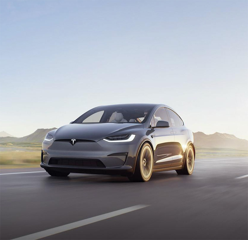 在Model S之後,Model X於2015年9月發表,這是一款6/7座電動休旅,被馬斯克形容為「車輪上的太空船」,最大亮點莫過於配置感應器的鷹翼門(Falcon Wing Doors),即便在狹窄車位也能優雅開啟。Model X在2021年改款,依然採獨特鷹翼門設計,配備賣點與Model S大致相同,都有橫向中控螢幕、後座8吋螢幕,同樣導入三馬達動力,以2.6秒的0-100km/h加速實力成為全球加速最強悍的量產休旅。