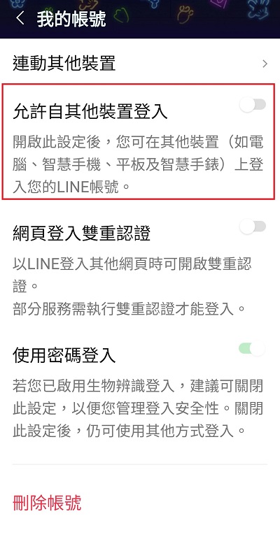 如果你平時只在手機上使用 LINE,沒有使用電腦版或平板的需求,請務必關閉此允許自其他裝置登入功能。