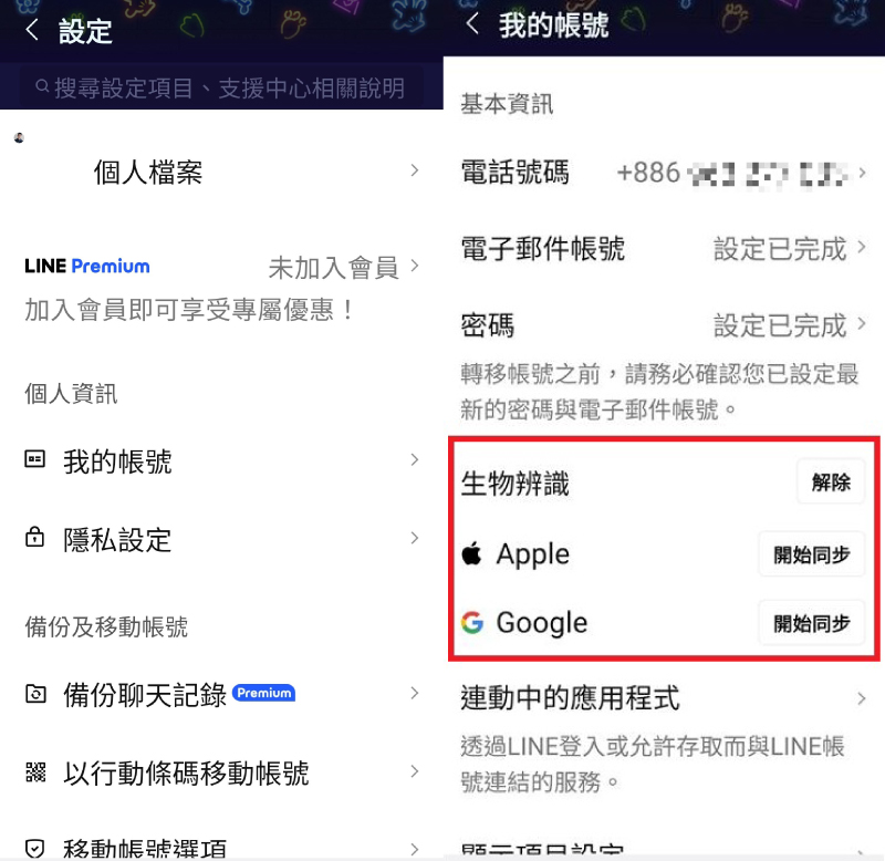 建議在LINE設定多重防護,可以進入「設定」>「我的帳號」,將Apple ID或Google 帳號連結,這能增加駭客破解的難度,在設定開啟 LINE App時需要 FaceID或密碼。