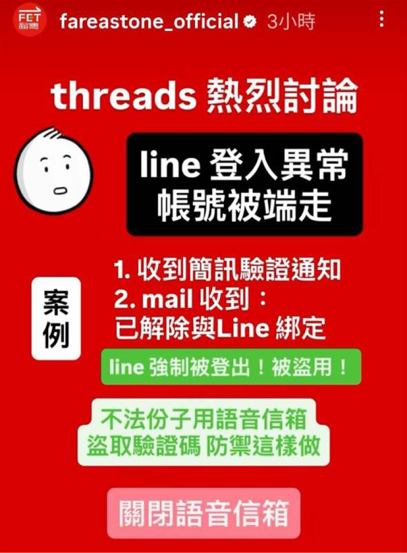 最近LINE帳號無預警被登出,且之後無法再登入,這是因為攻擊者利用特定電信業者語音信箱預設密碼的「遠端聽取」功能竊取驗證碼,解除與LINE綁定進行帳號移轉,LINE判定合法後原帳號被接管,導致好友群組資料全被清空,LINE帳號如同人間蒸發,貼文一出也搞得人心惶惶。