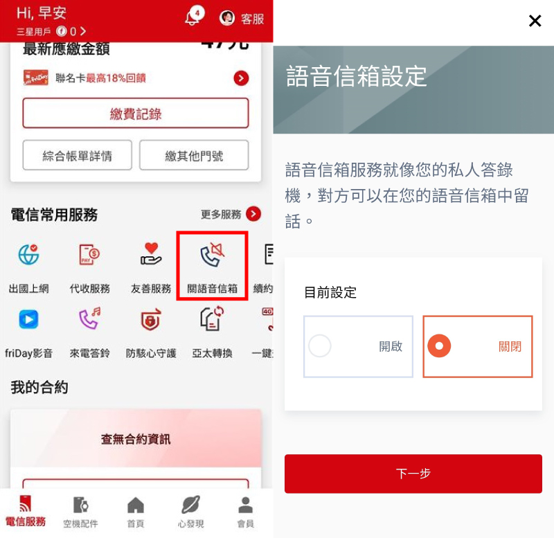 開啟遠傳APP「遠傳心生活」→進入電信服務首頁→點擊「關語音信箱」→確認完成步驟即可完成取消。