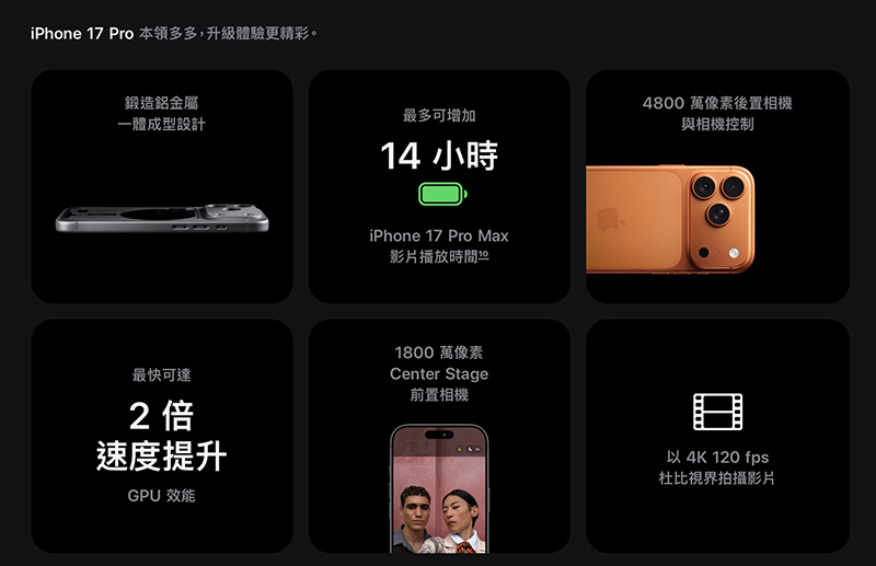 iPhone 17 Pro續航力已經相當出色,但根據最新曝光的消息指出,iPhone 18 Pro表現還會更上一層樓。(圖片來源:Apple)