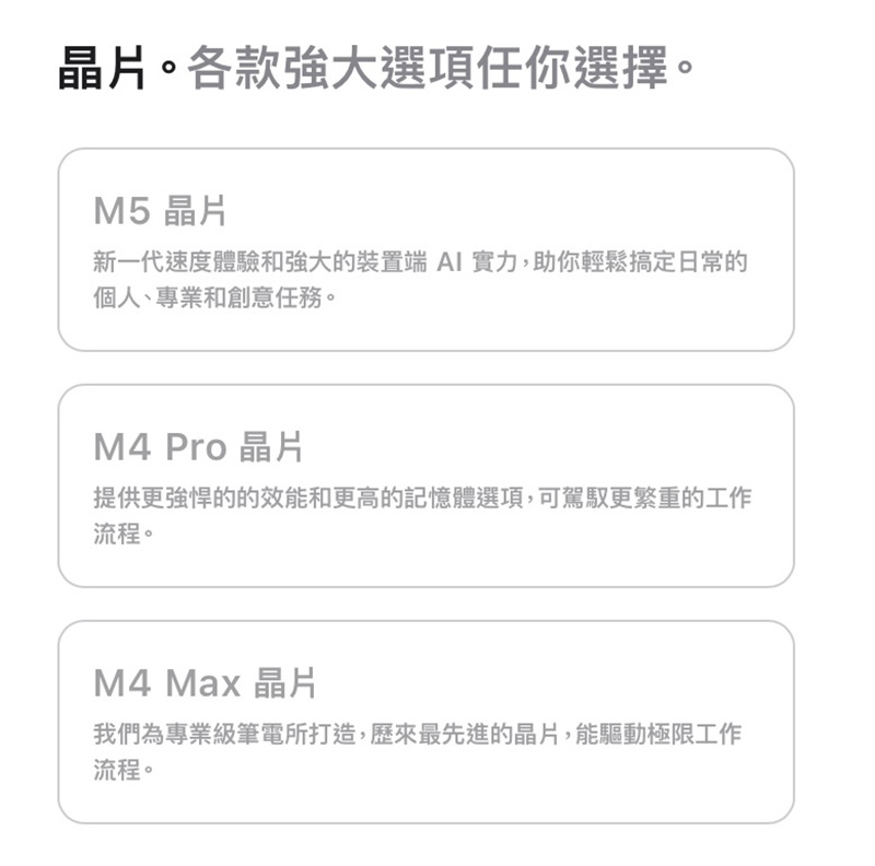 現有的MacBook Pro採用M5/M4 Pro/M4 Max三種晶片配置。(圖片來源:Apple)