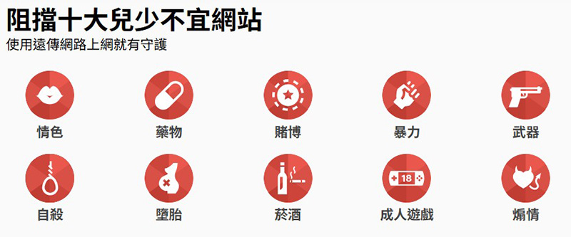 當遠傳「兒少心守護」偵測到情色、暴力、自殺、賭博、藥物......等兒童不宜內容,會自動把這些「壞東西」阻擋下來,還給孩子健康的上網環境。(圖片來源:遠傳FET)