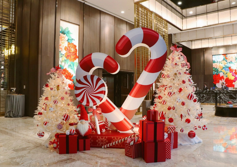 不以高聳的耶誕樹作為號召,板橋凱撒大飯店則是以溫馨活潑的童趣紅白拐杖情境,勾勒今年耶誕節的佈置主題。藉由記憶中甜蜜紅白拐杖的甜點滋味,再度喚醒人們感受年終美好佳節的幸福時刻。(圖片來源:板橋凱撒大飯店)
