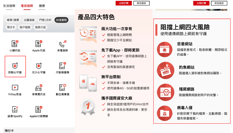 為了讓家長更放心讓孩童暢遊網路世界,也為了減少這類網路遊戲詐騙或是兒少不宜網站的點擊與瀏覽可能,現在遠傳攜手世界級網路資安大廠Allot合作,打造「防駭心守護」、「兒少心守護」服務,最低只要月付50元,透過遠傳心生活App申請,不用再額外下載任何App,就能即時更新毒駭資料庫提高防護阻擋的效果,無論是iOS或Android作業系統,只要是使用遠傳4G/5G行動上網的設備都可受到保護,就算熱點分享也可保護的妥當當,還能依個人或家庭需求提供服務,就能輕鬆過濾可能潛藏危機的駭客程式或問題內容。