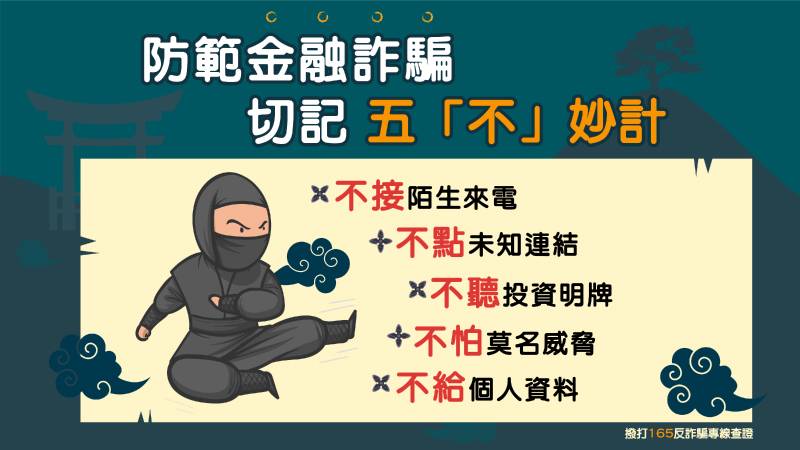 防範金融詐騙,切記五「不」妙計。(圖片來源:金融監督管理委員會)