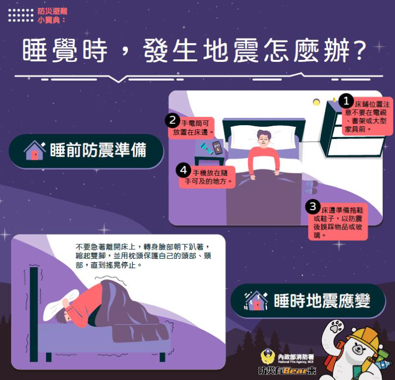 半夜發生地震時不要急著下床。(圖片來源:內政部消防署)