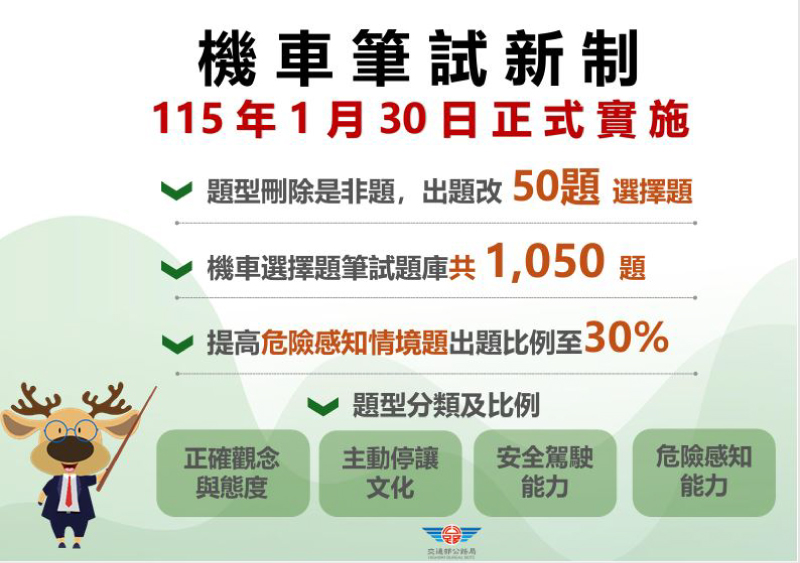 自2026 年 1 月 30 日起,機車駕照筆試將全面取消是非題!新制實施後,機車駕照筆試將從 1,050 題題庫中取 50 題「四選一選擇題」,過去考生有 50%的機會猜中答案,未來如果不仔細詳讀考古題,可能就沒有這樣的好運氣。