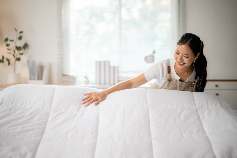 這裡是個人物品最多的地方,因此首先要對衣櫃、抽屜進行斷捨離。接著由上而下清潔燈具、拆洗窗簾,棉被和床墊等過敏原(塵蟎、棉絮)的集散地要仔細拍打吸塵,最後才清潔地板。