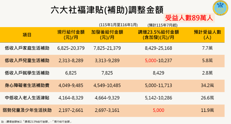 衛福部為加強照顧弱勢所規劃的「六大社福津貼調增方案」,預計將在今年 7 月與老農津貼、國民年金等相關法案修法後同步上路。