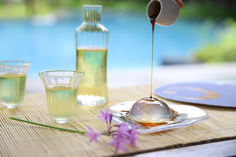 這次「沐暑渡假村」還安排了一頓非常特別的午餐,主廚將清爽的日式蕎麥麵放入冬瓜盅,搭配海膽、鮑魚、牡丹蝦等高級海鮮,以及能補充維生素的冬瓜絲,呈現出光是視覺效果就美到不行的「冬瓜琥珀果凍涼風蕎麥麵」,上面還妝點了些金箔、食用性草花,藉由視覺與味覺的雙重享受來釋放身心暑氣。